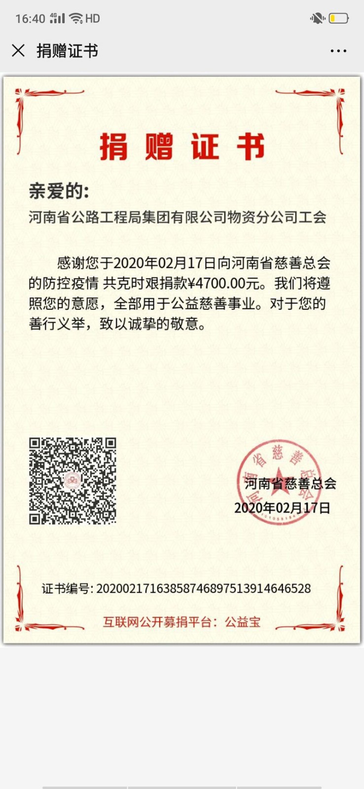 為抗擊新型冠狀病毒感染的肺炎疫情,近日,物資分公司員工在疫情防控這個(gè)沒有硝煙的戰(zhàn)場自發(fā)捐款獻(xiàn)愛心,公司員工合計(jì)為抗擊疫情獻(xiàn)愛心捐款9650元已以工會(huì)名義上交河南省慈善總會(huì)。(物資分公司)