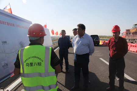 10月1日,新疆維吾爾自治區(qū)交通廳黨委委員、副廳長(zhǎng)艾斯卡爾·牙合甫視察烏奎改擴(kuò)建項(xiàng)目。