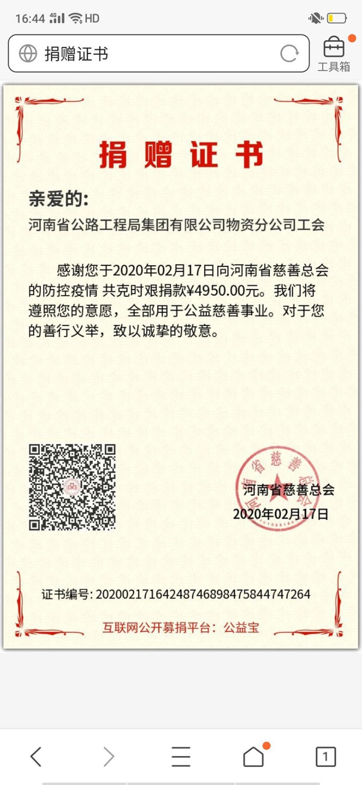 為抗擊新型冠狀病毒感染的肺炎疫情,近日,物資分公司員工在疫情防控這個(gè)沒有硝煙的戰(zhàn)場自發(fā)捐款獻(xiàn)愛心,公司員工合計(jì)為抗擊疫情獻(xiàn)愛心捐款9650元已以工會(huì)名義上交河南省慈善總會(huì)。(物資分公司)