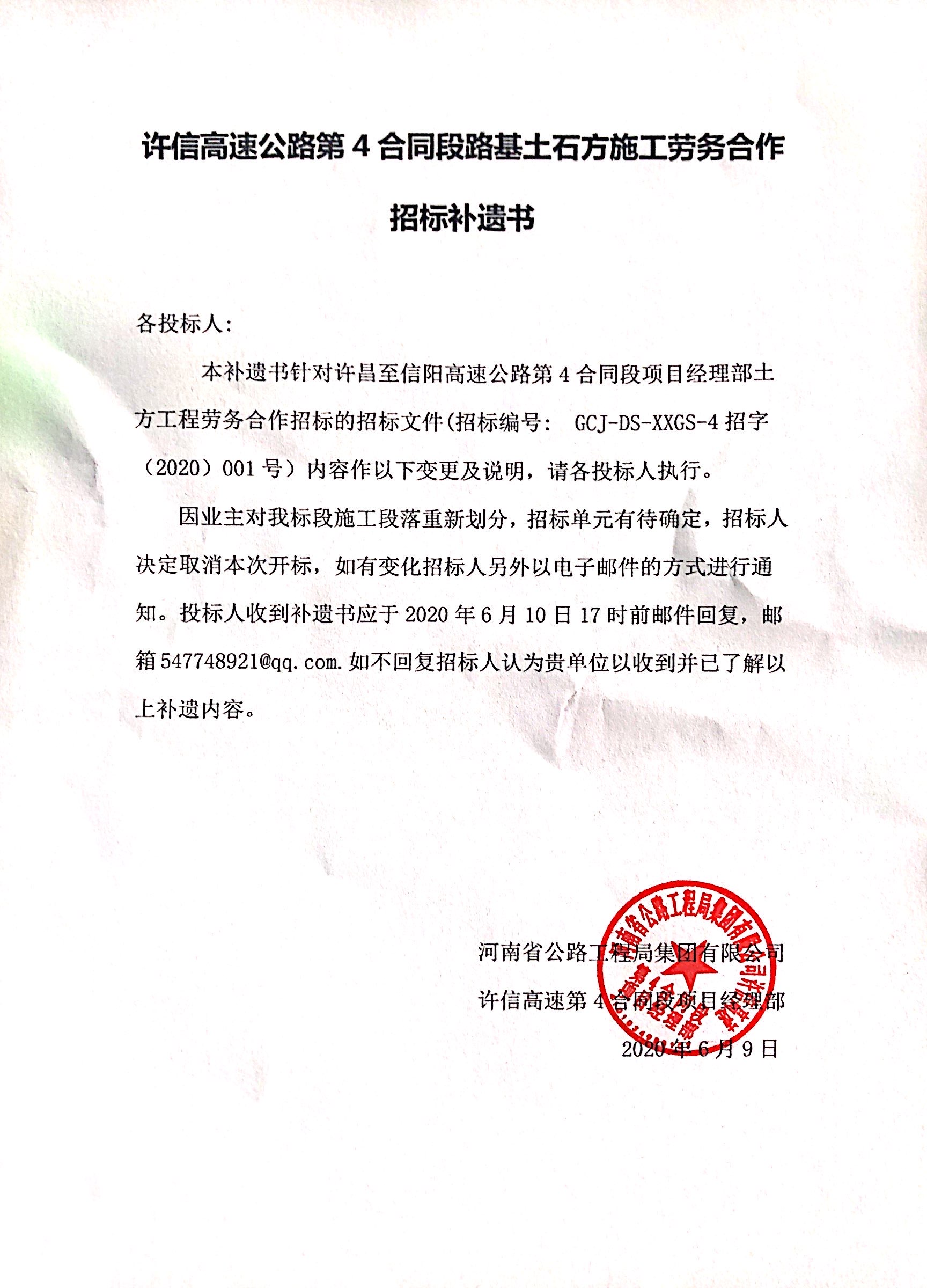 因業(yè)主對我標(biāo)段施工段落重新劃分,招標(biāo)單元有待確定,招標(biāo)人決定取消本次開標(biāo),如有變化招標(biāo)人另外以電子郵件的方式進(jìn)行通知。投標(biāo)人收到補(bǔ)遺書應(yīng)于2020年6月10日17時前郵件回復(fù),郵箱547748921@qq.com.如不回復(fù)招標(biāo)人認(rèn)為貴單位以收到并已了解以上補(bǔ)遺內(nèi)容。